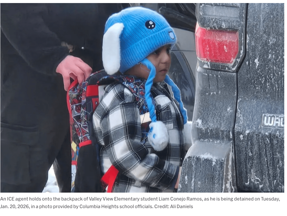 A picture of the 5-year-old Valley View student being detained by ICE Tuesday afternoon after school. According to our superintendent, the family has an open asylum case with a “no deport” order. Nevertheless, the pre-k student is “being held at a detention center in Texas.” A report by the local CBS affiliate, here. And Sahan Journal, here. The picture, in the Sahan Journal piece, of his teacher wiping away tears while listening to district officials talk about her student at a press conference today, is just about more than I can tolerate. Three other Columbia Heights students have been detained, two high-schoolers and a 10-year-old. What fresh hell next? “This is not the worst, so long as we can say, ‘This is the worst.’”